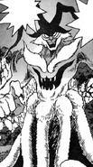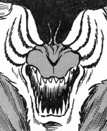 Atrocious was a towering demon with slight feline features. He had pink fur and several tails spread across the lower part of his body. He had a spiked white beard and dropped yellow coloured eyes. He had a pair of long blue antenna. On his chest was a large mouth lined with fanged teeth, a large pink furred crest was lined above it and tiny eyes hidden underneath. His original form seemed to resemble a large saber-toothed tiger.