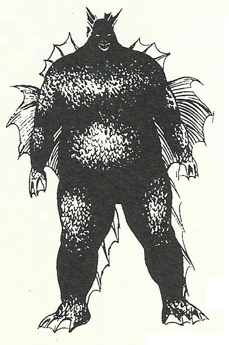 Balass resembled a large aquatic humanoid covered from head to toe in scales, with a bulky and domineering body. He had small eyes and webbed hands and toes. His head, arms, back legs and shoulders were lined with sharp ridged fins.