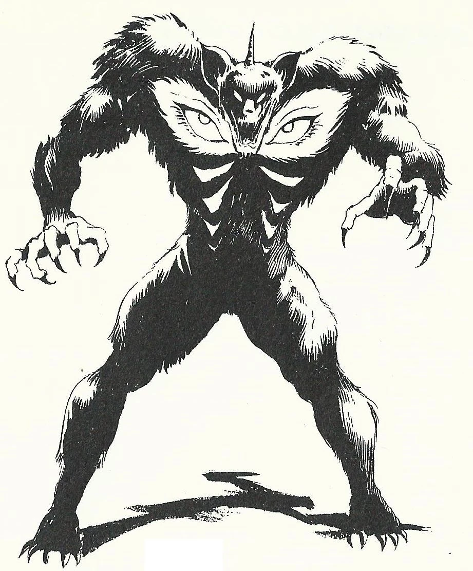 He slightly resembled a cross between a rat and a dog, He was covered in thick fur, had a short tail, and had a horn in the centre of his forehead, large arms and legs, large pointed ears, and his chest has a large pair of eyes.