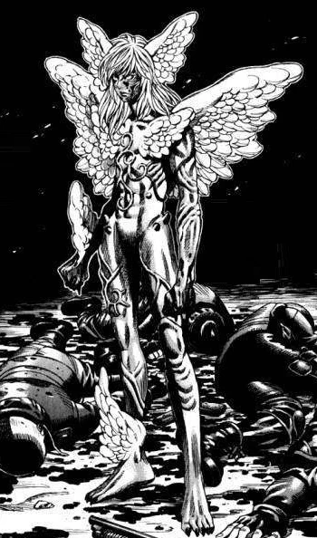 His wings enables him to fly and he has the strength to cut an armoured man in half with a single movement.