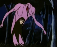 Meg's true appearance was a large purple slug-like creature. She stood several meters tall with her human-like face located on her stomach surrounded by a black mark, and another yellow eyed head with three long proboscides on the top. She had gangly arms with small claws and her legs formed into a long trail. When in flight her arms would extend into wings.
