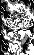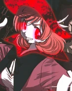 When in her Devilman form her clothing disappears and her body becomes encased in flames covering her private areas, the demon Medoc forms on the top of her head while still under her hat, and flame topped knee high boots and elbow length gloves.
