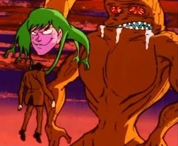 Later that night Rockfel steals the skull and murders Makimura's assistant Yamaguchi before absorbing the skull and transforming into a gigantic version of the girl it once belonged too. Rockfel then begins to cause trouble on the highway, destroying several cars, roads and people before he grabs Dr. Makimura in his arms. Devilman quickly arrives and saves Makimura before doing combat with Rockfel. Rockfel proves more of a threat but is eventually knocked down and teleported away by Zannin who asks if Rockfel needed any help, Rockfel however tells Zannin he intended to bring Devilman down on his own and leaves.