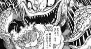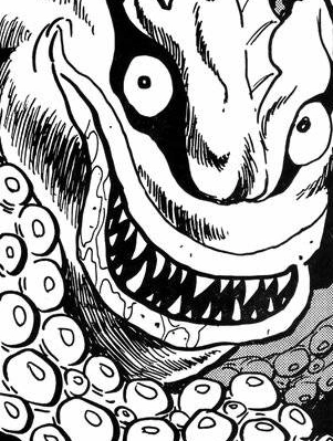 Sagohabu was a massive tentacled demon. He had big thick lips with large teeth, a dorsal fin going down his head and small eyes with large dark markings around them.