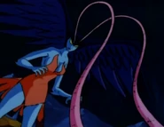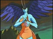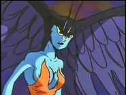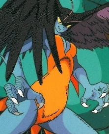 Sirene's appearance in the 1972 Anime sits in contrast to her appearances in other entries in the Devilman franchise. Sirene had blue skin, ample breasts and a large pair of wings at the sides of her head allowing her to fly, her hands and feet formed into bird talons, she had orange feathers covering her body, and a birds tail behind. She had yellow eyes with red pupils and a pair of antenna.