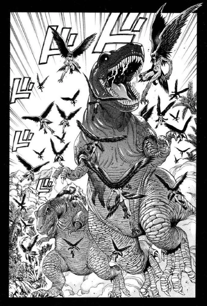 Later when on her own Sheena tries to fly despite losing her wings but simply falls down a cliff, were she is attacked by a swarm of Tyrannosaurs, however before they can fight they are suddenly wiped out by the creature Sheena had dubbed the "White Monster".