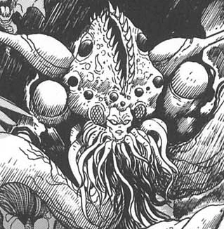 A large Devilman with a large mouth atop his head with large teeth and several black eyes dotted about. beside his human face were two large compound eyes and underneath was a mass collection of tentacles. He also had two more even larger tentacles which split into mouths at the end splitting into teeth.