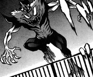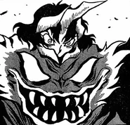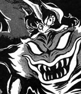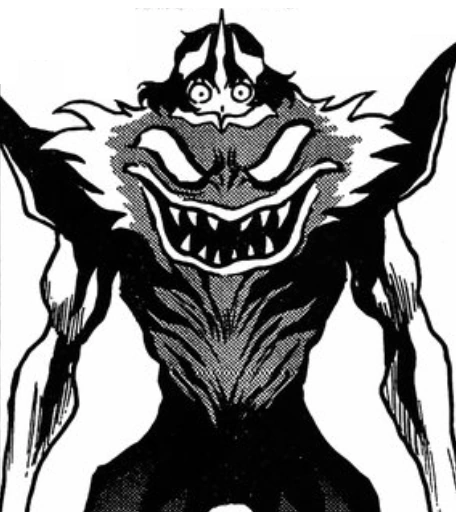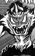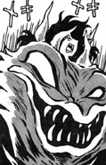 Wagreb was a large bestial demon. She had a large face on the upper half of his chest with large lips and a large layer of sharp teeth with large eyes. She had long arms allowing for her to run on all fours with long clawed hands. She had the face of her human host Rena sticking out the top with a large horn in the center.