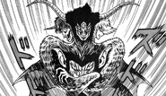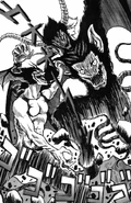 Much like his manga incarnation, Zennon is a towering beast with thick black fur covering his body and bat-like purple wings under his arms. He has three heads, the left one being a one-horned ogre, the central being the most bestial with large horns and three eyes and the third head resembling some kind of feminine human appearance. On its chest there is a large bat-like face with sharp fangs.